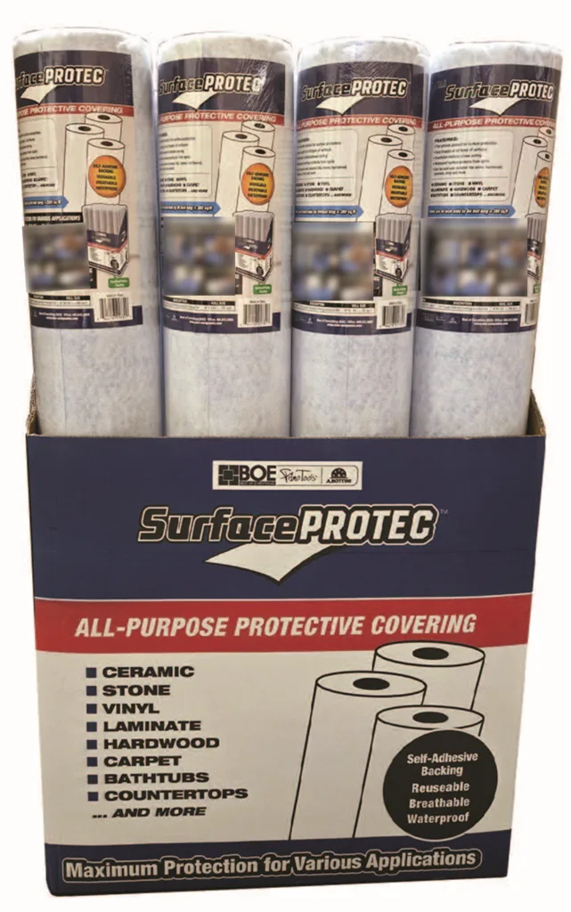 Our new SurfacePROTEC is the ultimate jobsite protection. With a self-adhesive backing, it is reusable, breathable, and waterproof. Its flexibility allows it to be used on any home surfaces, including floors, stairs, bathtubs, and countertops. It is fit for a variety of materials- including ceramic, stone, vinyl, laminate, hardwood, carpet, and more.